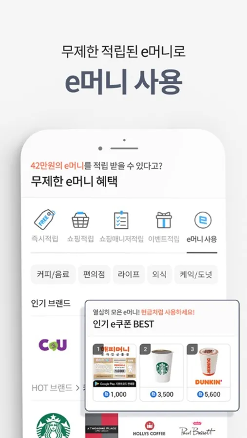 - 적립된 e머니는 'e쿠폰 스토어' 에서 다양한 상품으로 교환 하실 수 있습니다.
