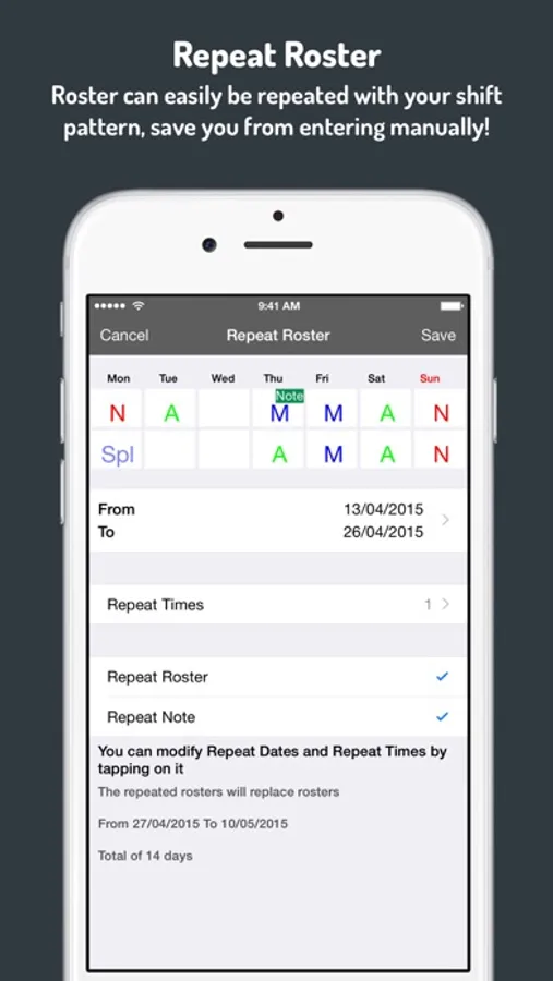With Full Version, you can choose to repeat your roster over a period. So if you have a repeated roster every 4 weeks, all you need to do is to keep repeating that period and you won’t need to manually enter your roster any more. There is also “Note” function that comes with Full Version as well which you can add note to any calendar date you want. Last but not least, you can sync your roster to your iOS calendar so you can even check your rosters without opening Simple Roster