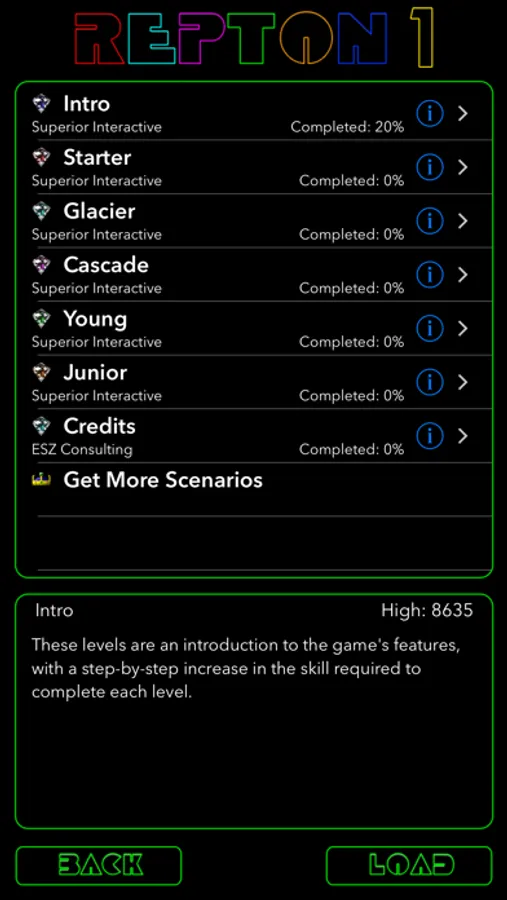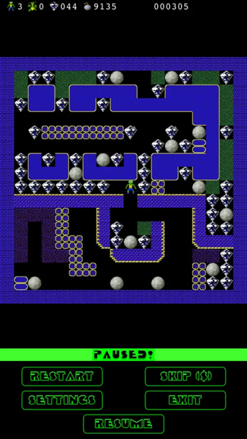 In-app purchasing via the in game store lets you download new and exciting Repton 1 scenario packs adding new levels and the ability to skip a level if you get stuck.