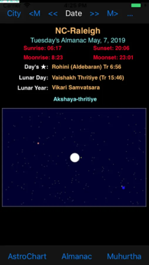 This provides current calendar date with Sunrise, Sunset, Moonrise, Moon-set, day’s star and tithi with its transition time, lunar month, and year followed by any major festival events for the given city of choice. Users can navigate through days and months for the current year that gives corresponding Vedic almanac details as well as charts for planetary positions.