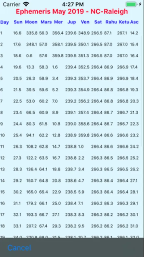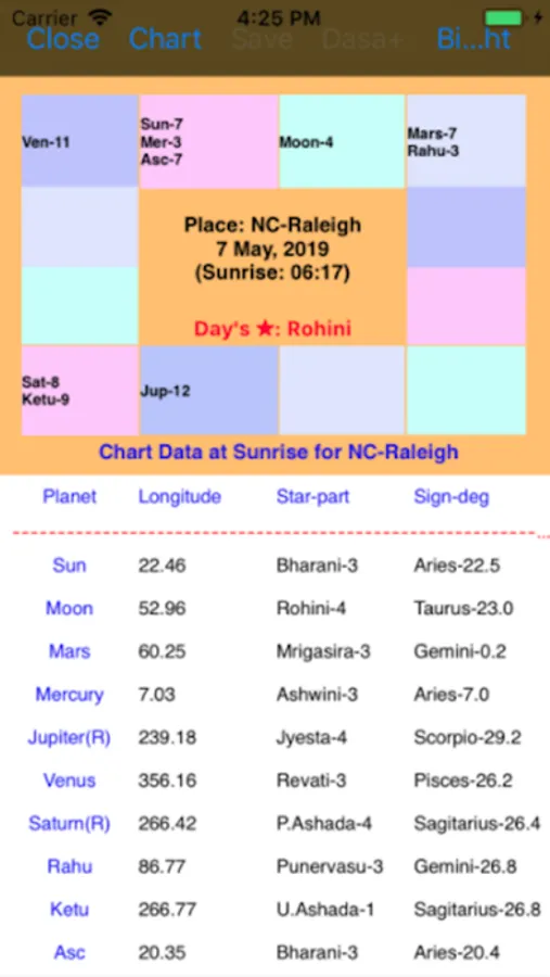 By default, it gives the traditional chart with zodiacal details in terms of its longitude and position with respect to different constellations for the date selected on the home screen. Therefore one can navigate the home screen to set any day in the current year to obtain the day’s chart. Chart type button is provided in the toolbar to quickly switch between chart formats from south Indian to north Indian style as shown in the screen shots.