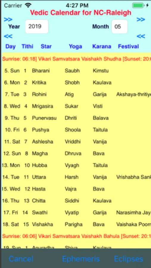 This section gives the almanac details for given month and year that enables the user to quickly glance through the list of important festivals, days for rituals etc. in order to plan personal calendar of activities. Calendar is further supplemented with ephemeris data table and eclipses provided in a separate screen.
