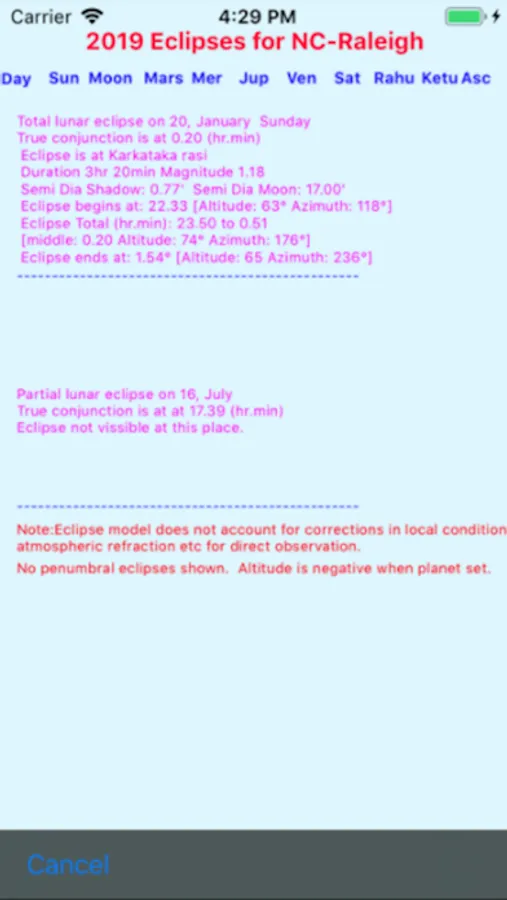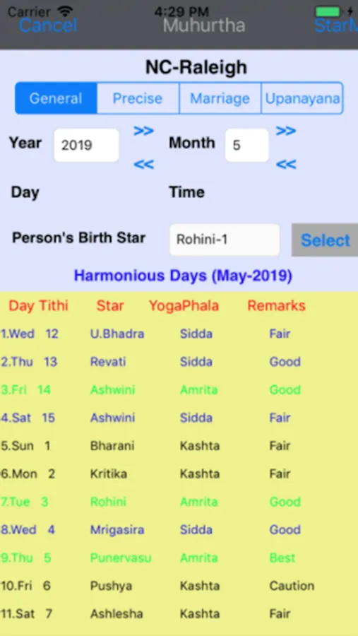 This is covered under major four categories i.e., General purpose, Precise, Marriage and Upanayana. App generates calendar of for the given year and month with almanac details. In general-purpose category, harmonious days are listed with its suitability with respect to an individual birth star and given in the remarks column. App notes has details on election criteria applied for both Marriage and Upanayana since there can be different versions possible with exceptions. This should help users to understand the difference between their respective local traditions and rules applied in this app.