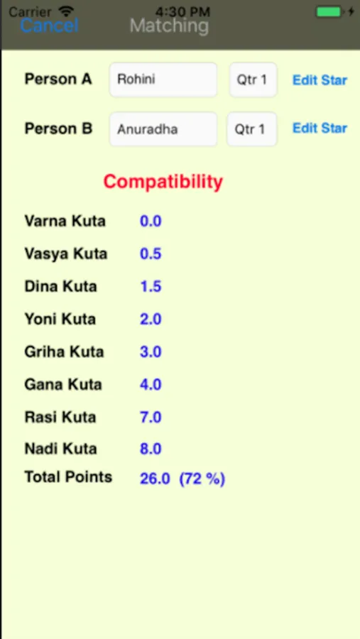 In addition, this section also provides a menu for matrimonial for matching stars that gives points scored under individual category with overall compatibility in percentages.
