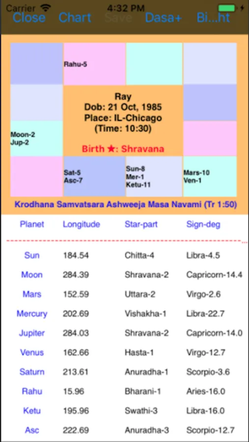 In addition, one can also cast individual horoscope based on place and time. Upon casting, a five page scrolled output provides additional details on major astrological analysis listed below.