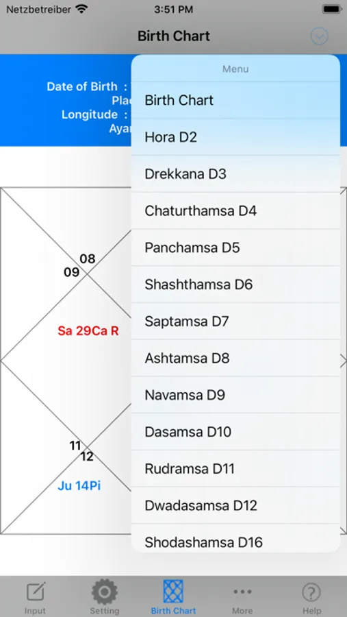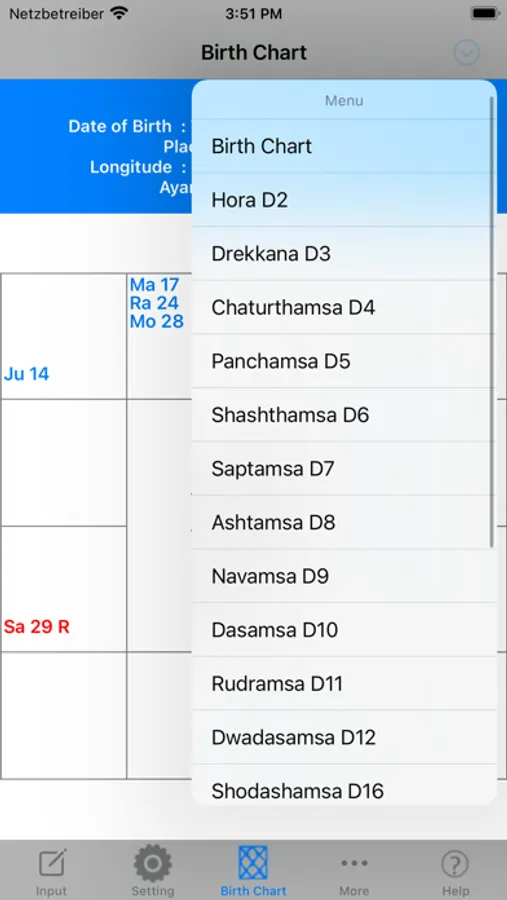 - Divisional (Varga) charts i.e. Hora, Drekkana,Chaturthmsa, Saptamsa, Navamsa, Trimsamsa and D10,D11,D12,D16,D20,D24,D27,D30,D40,D45,D60 with degrees.