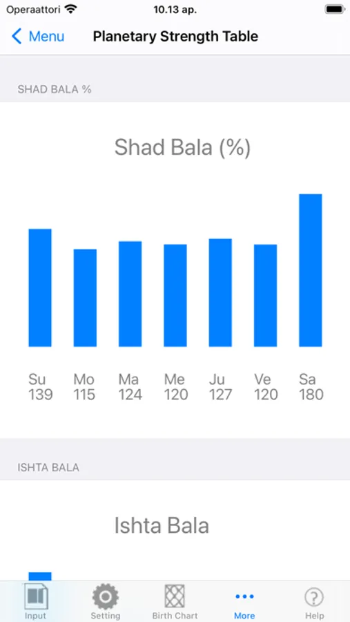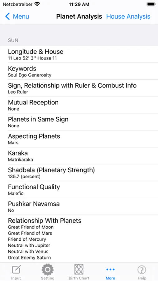 - Planetary Strength (Shadabala) as total strength as well as itemised strength.
