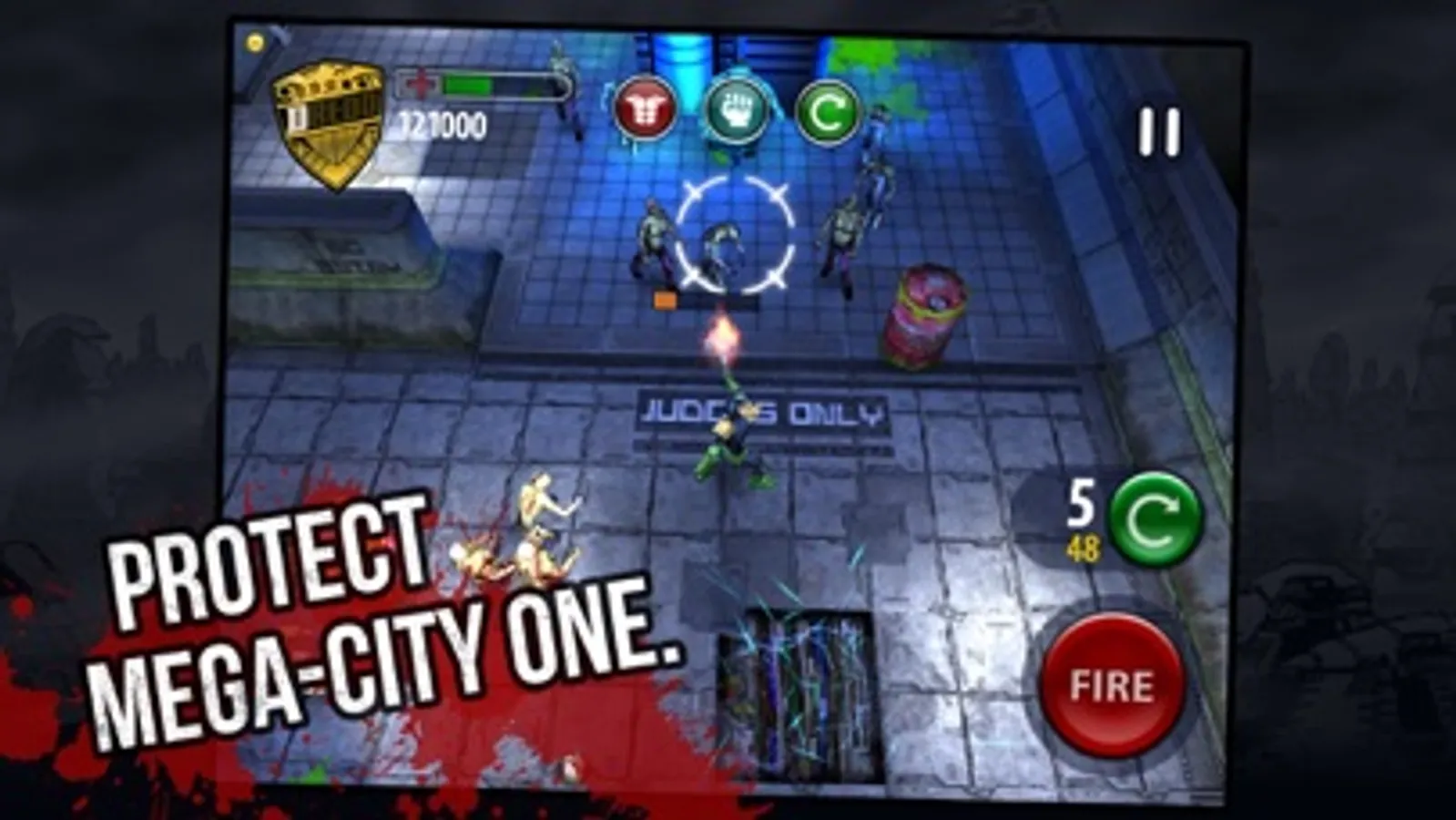 You must protect Mega-City One from a zombie invasion! Arm yourself with a Lawgiver pistol and three other devastating, upgradable weapons. Fight four deadly zombie archetypes in thirty levels of game play. Choose from seven special upgrades to give you an edge over your undead foe!