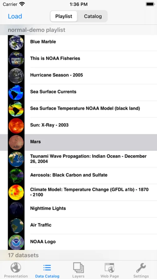 • Quickly search and browse the entire SOS Data Catalog and select datasets at random to load on the sphere