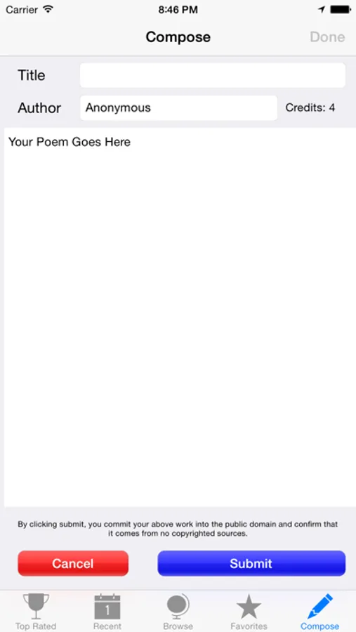 All original content submitted to Poemz is put into the public domain. Copyrighted and overtly offensive content will be deleted and users who submit copyrighted or overtly offensive content will be banned.