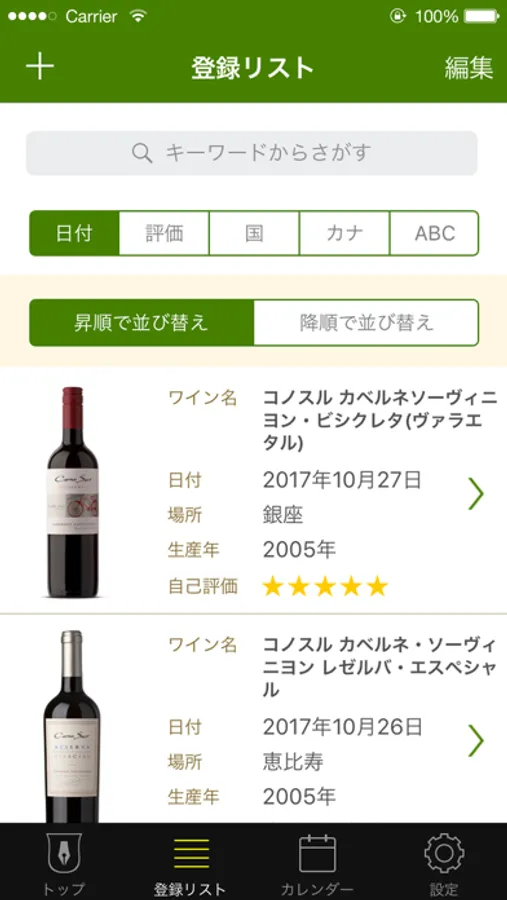 ワインの特徴を感じるままに、タップ操作で記録する 事ができ、色、香り、味わい、合わせたい料理等を、