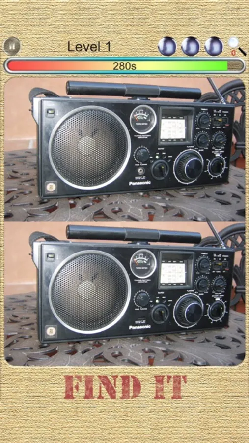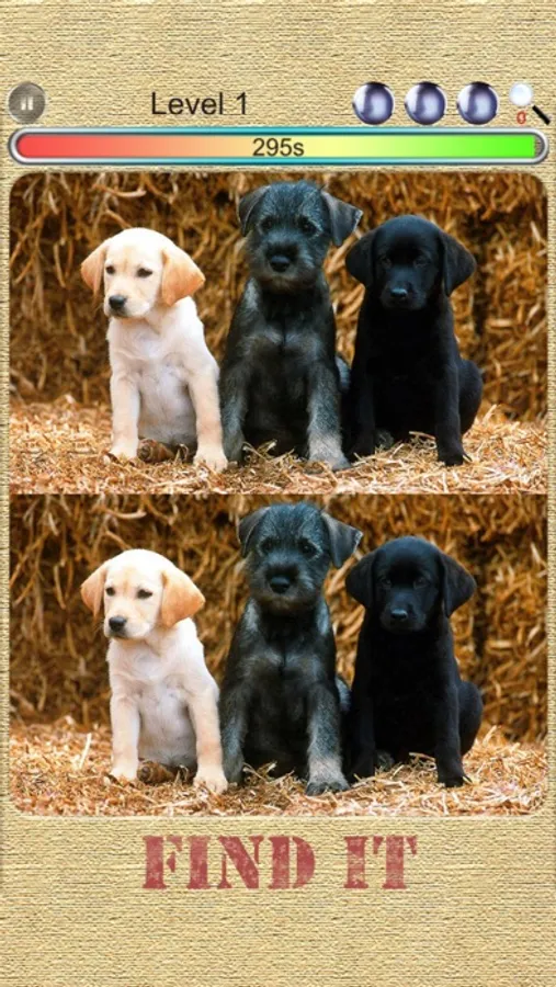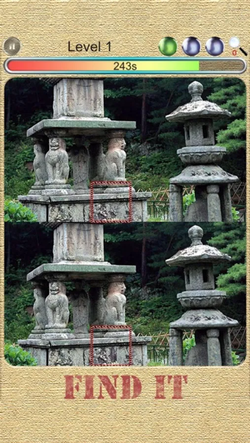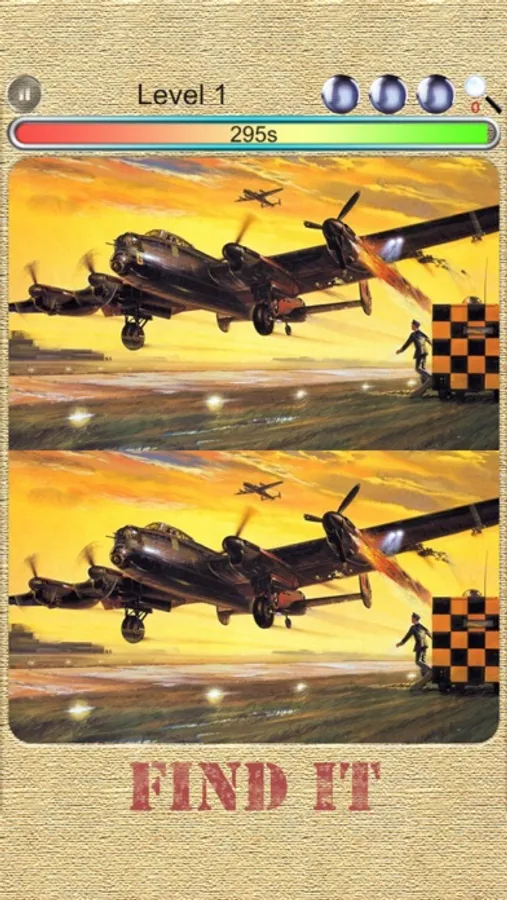 Each picture has 3 different, find the correct different add 15 sec. But when touch wrong position, time will decrease 30 sec.