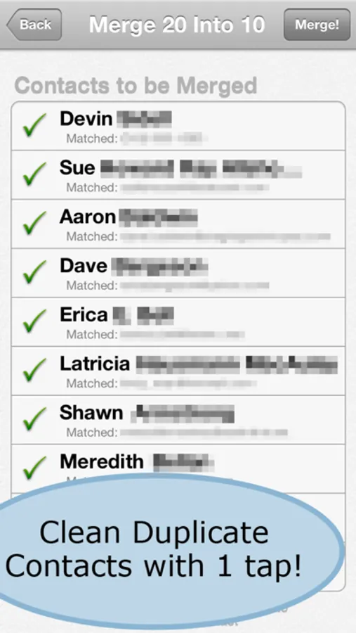 Automatic Cleanup finds duplicate contacts with the same name and same phone or email to quickly and automatically combine doubles. Or cleanup yourself, to decide how to combine the doubles into one.