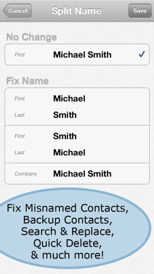 Find misnamed contacts, such as those with only a first name, to quickly add the missing parts. Even search and replace to get rid of old information that other phones may have left around in your address book.
