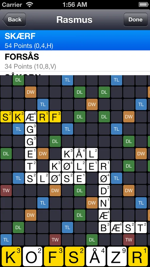 The tiles in your rack and on the board can be changed by dragging letters from the top of the game view. Touch "Suggestions" to get suggestions for words to play. Pick a word and press "Done" to play a word. If you don't want to play a word, press "Back". To erase, drag the tile with the text "erase". To manipulate multipliers, press the plus sign and use the multipliers in the same way as the letters.