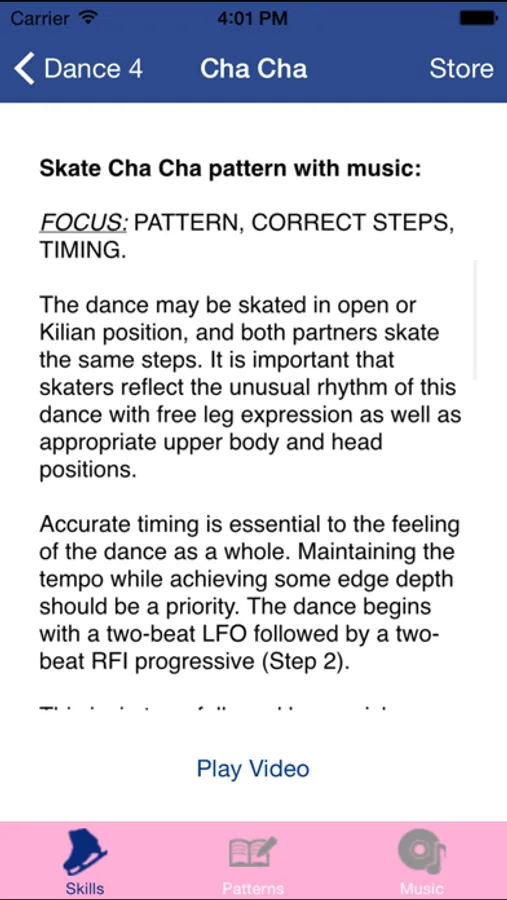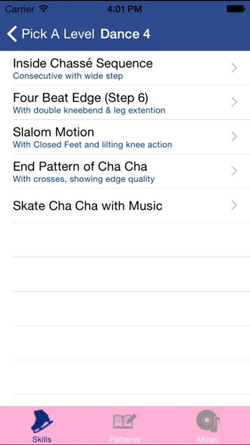 The Dance 1-6 app focuses on the components of ice dancing and reviews the basic edges & turns, all while skating to music. Skaters will complete the first 6 compulsory dances, which can then be tested solo or with a partner.
