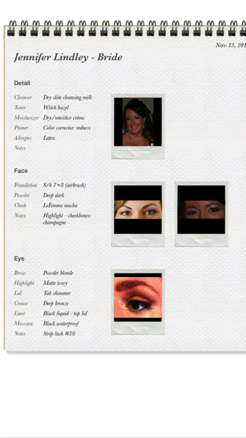 • Add clients to events for each face chart you want to create. Enter detailed notes on techniques and shades and take unlimited photos of your work, detailing each section of the face. Add custom fields and categories as you work. Sort clients by name or by title.