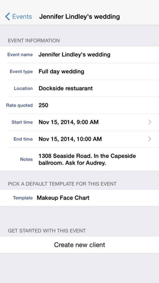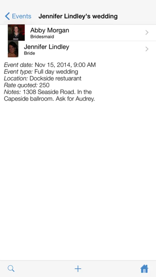 • Keep track of individual events including starting and ending times, location, and rate quoted. Sort events by name or by date to quickly find the event you are looking for.