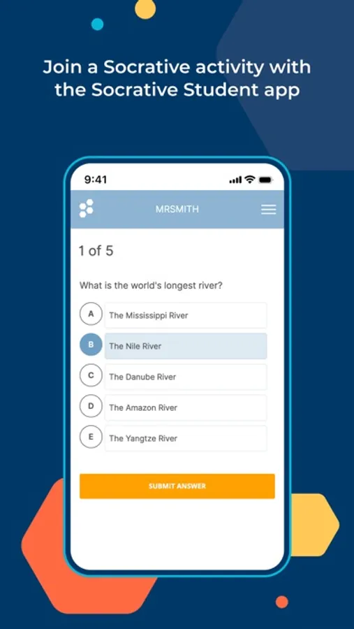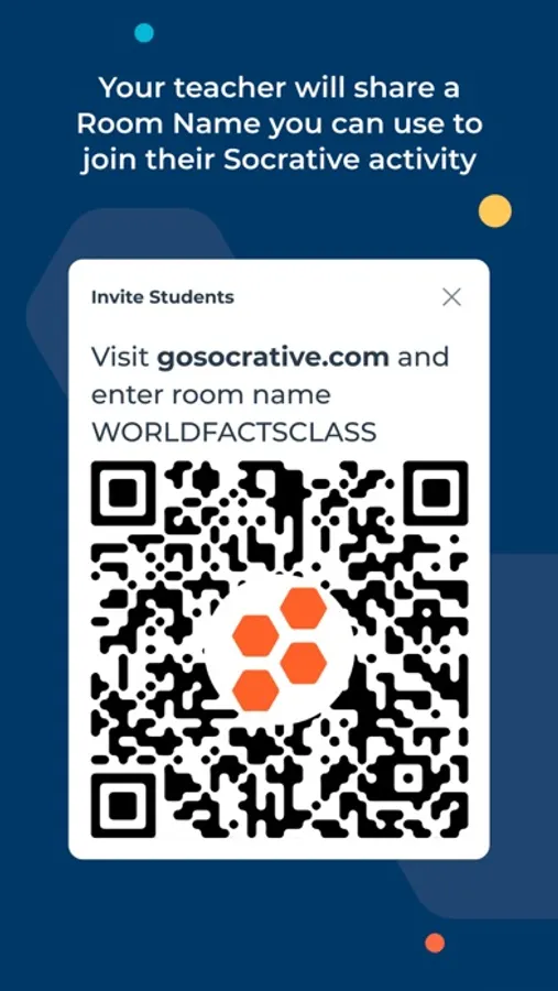 Students share their understanding by answering formative assessment questions in a variety of formats: quizzes, quick question polls, exit tickets and space races. Once students launch the Socrative Student App, they'll be prompted to join the teacher's room via the teacher's unique code. No student accounts necessary!