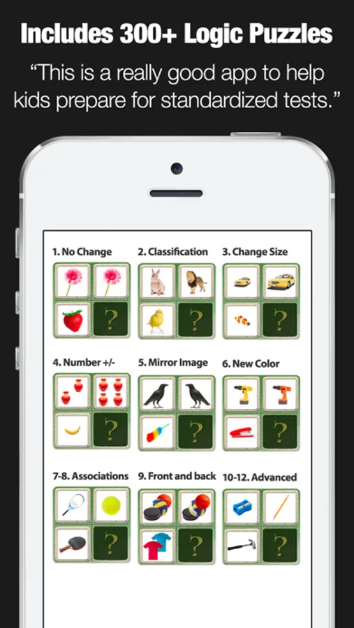 This application will help your kids dramatically improve their analytical reasoning skills and give them the confidence to breeze through any test that includes logic puzzles and analogies.