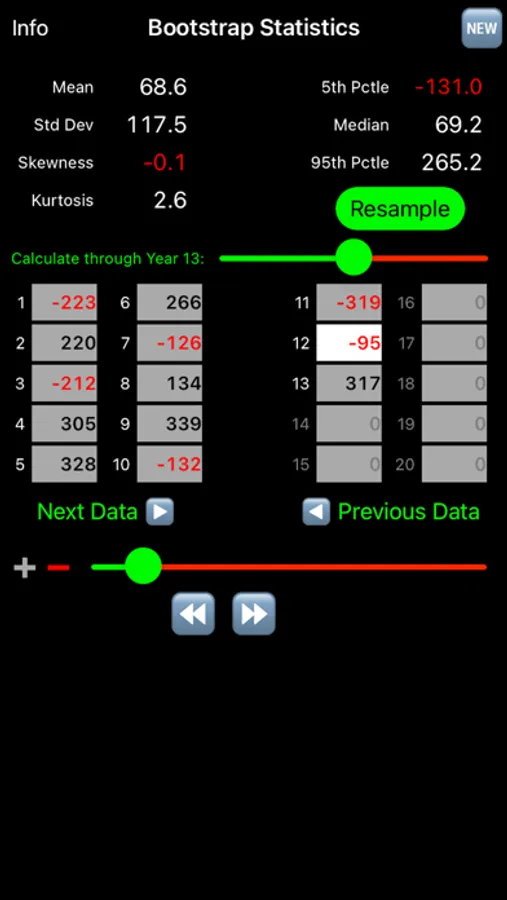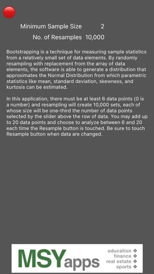 In this application, there must be at least 6 data points (0 is a number) and resampling will create 10,000 or more sets, each of whose size will be user-defined in the iPad version or 2 in the iPhone version.