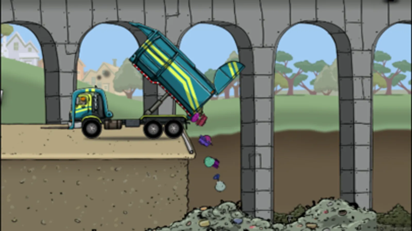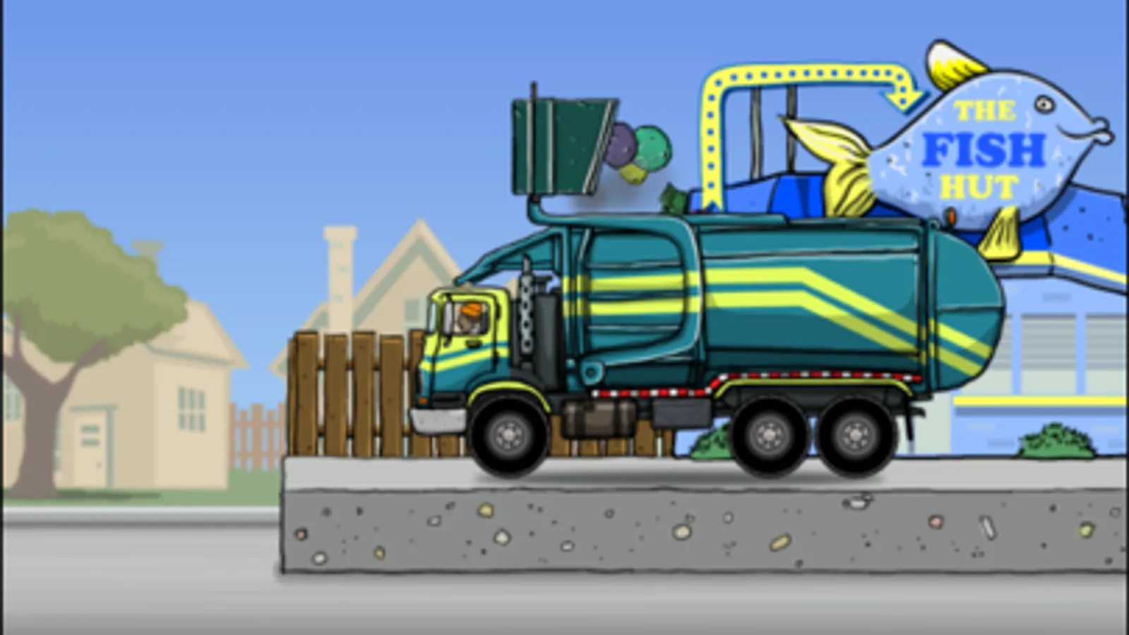 Ride along on a front loading garbage truck as it drives through a neighborhood and stops to pick up dumpsters at local businesses. Help the garbage man pick up the dumpsters in the big dumpster truck. After three dumpsters, visit the Landfill to empty the truck!