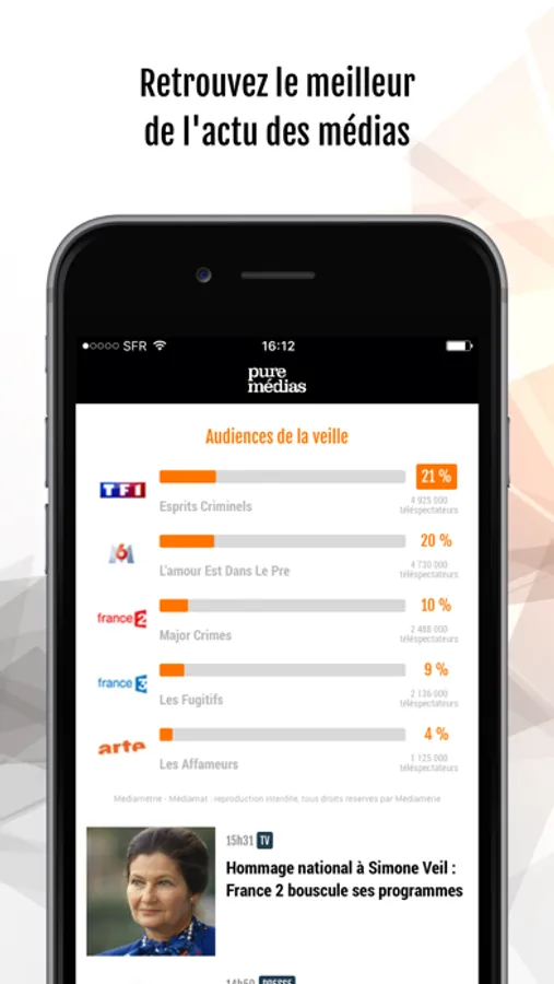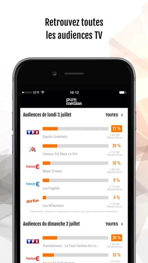 - les audiences TV de la veille (chaînes linéaires hertziennes et TNT), avec des analyses et bilans d'audiences sur les grands rendez-vous