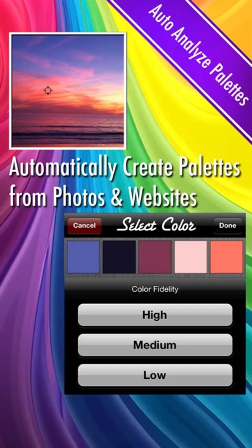 Automatically create full color palettes from photographs and websites. Adjust the color fidelity to extract more/less colors.