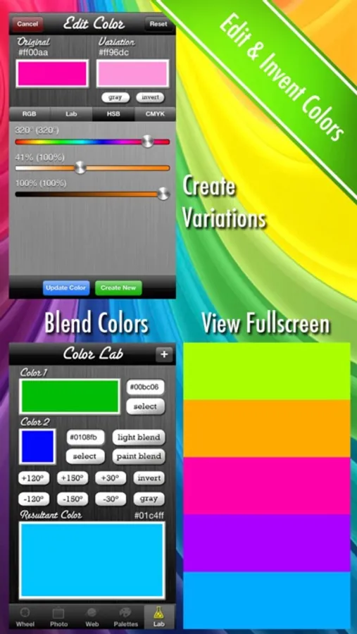 Edit colors to create color variations with RGB, Lab, HSB, and CMYK sliders.