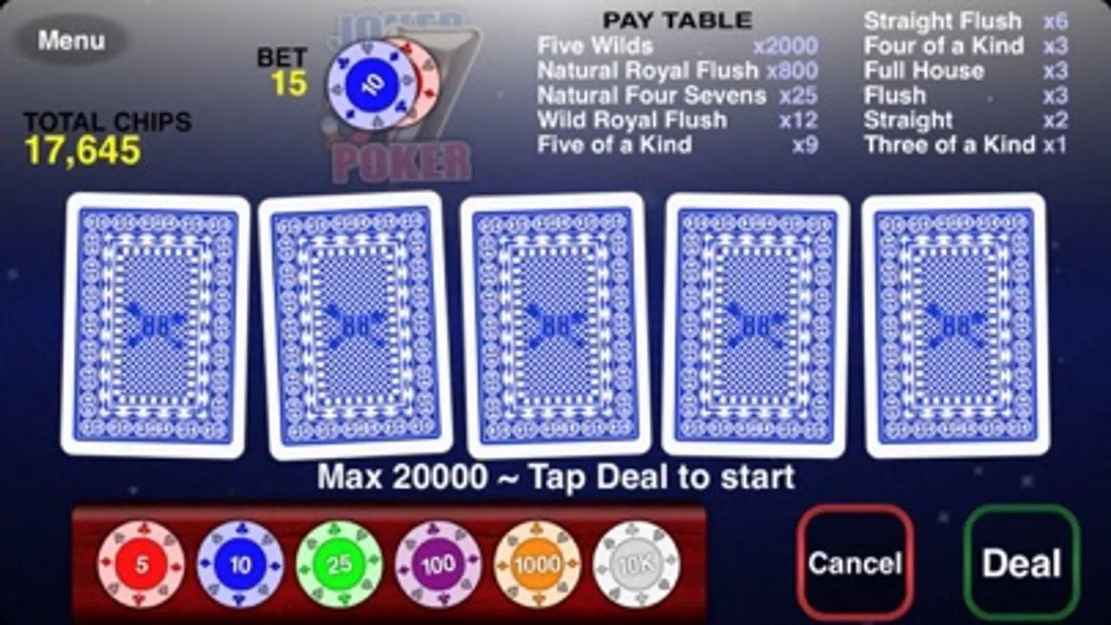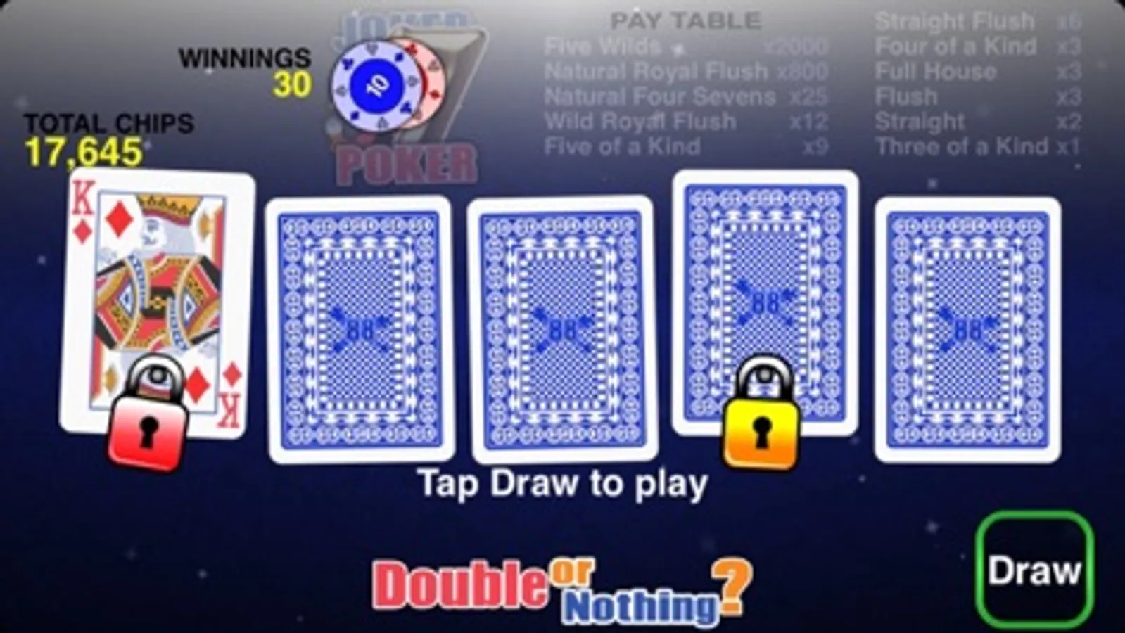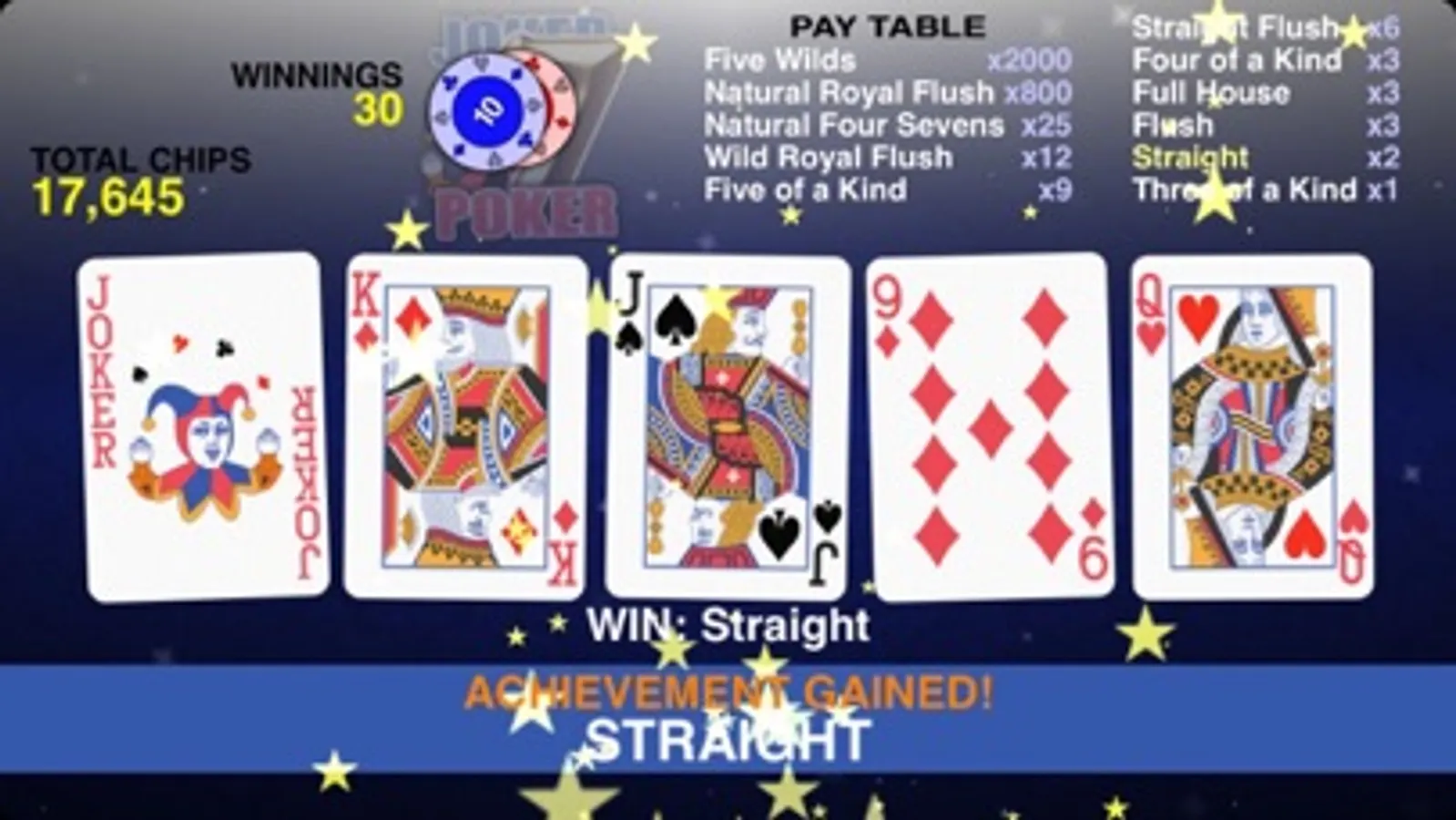 Joker Poker 88 is fun video poker with great animated cards and addictive play. There is a joker in the pack that can be any card! It's free to download so enjoy and good luck!
