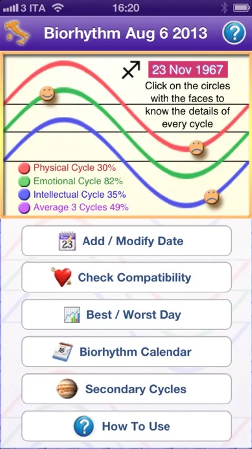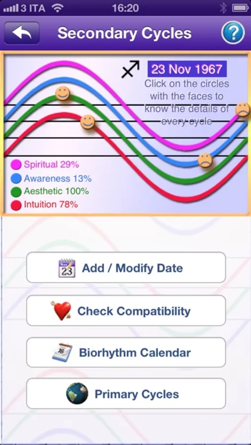 Biorhythm Pro is a calculator of biorhythm cycles that will let you know every day the condition of your three primary biorhythm cycles, the physical cycle, the emotional cycle and the intellectual cycle and the 4 secondary cycles, the spiritual cycle, the awareness cycle, the aesthetic cycle and the intuition cycle.