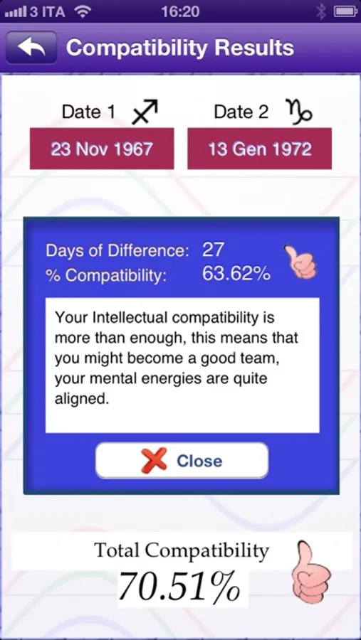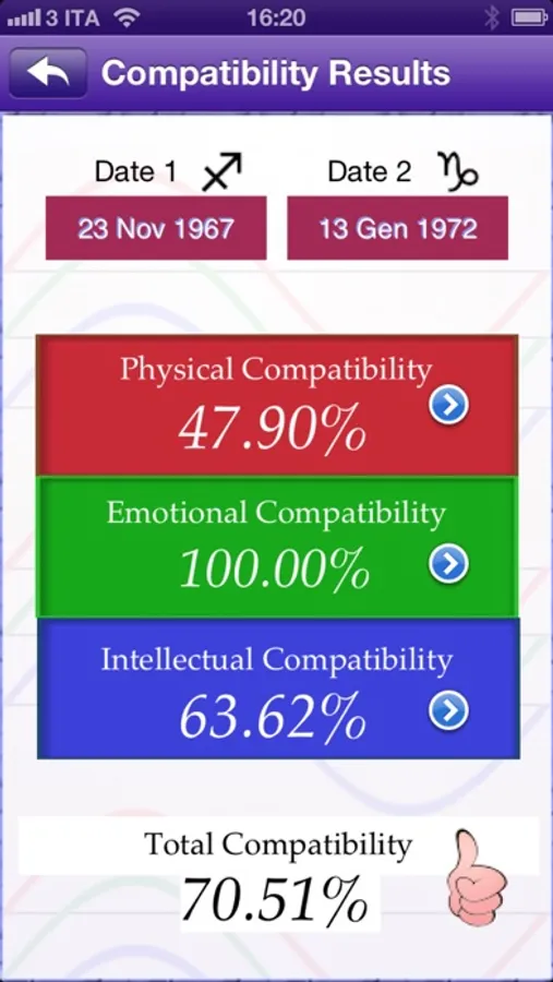 You can also calculate the biorhythm compatibility between you and another person discovering the percentage of compatibility for each cycle and the overall percentage of compatibility. This way you'll know what is your best partner in love, in business, in sports, in meditation, in arts and so on!
