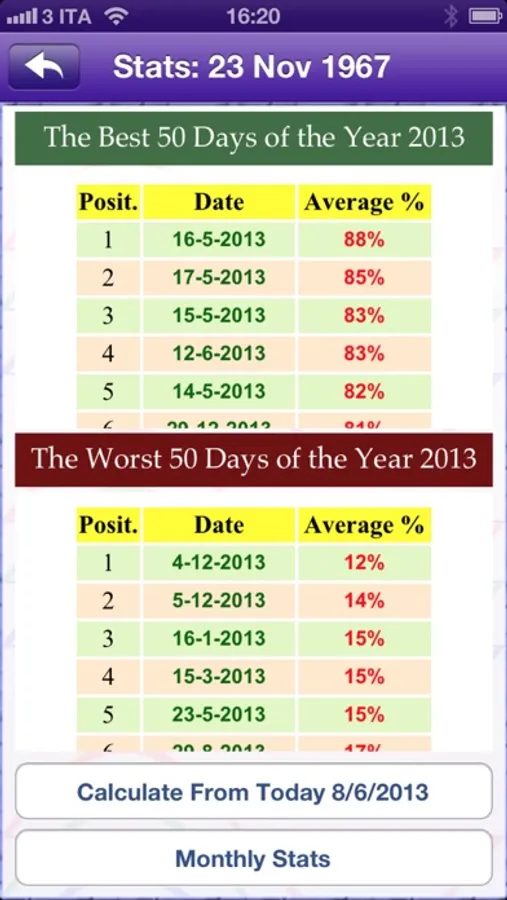 Another useful special feature of Biorhythm Pro will give you monthly and annual statistics of the three primary biorhythm cycles, so you'll know which are the best days and the worst days of the year and for every month.