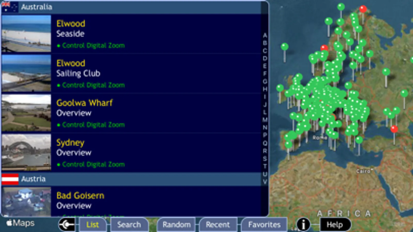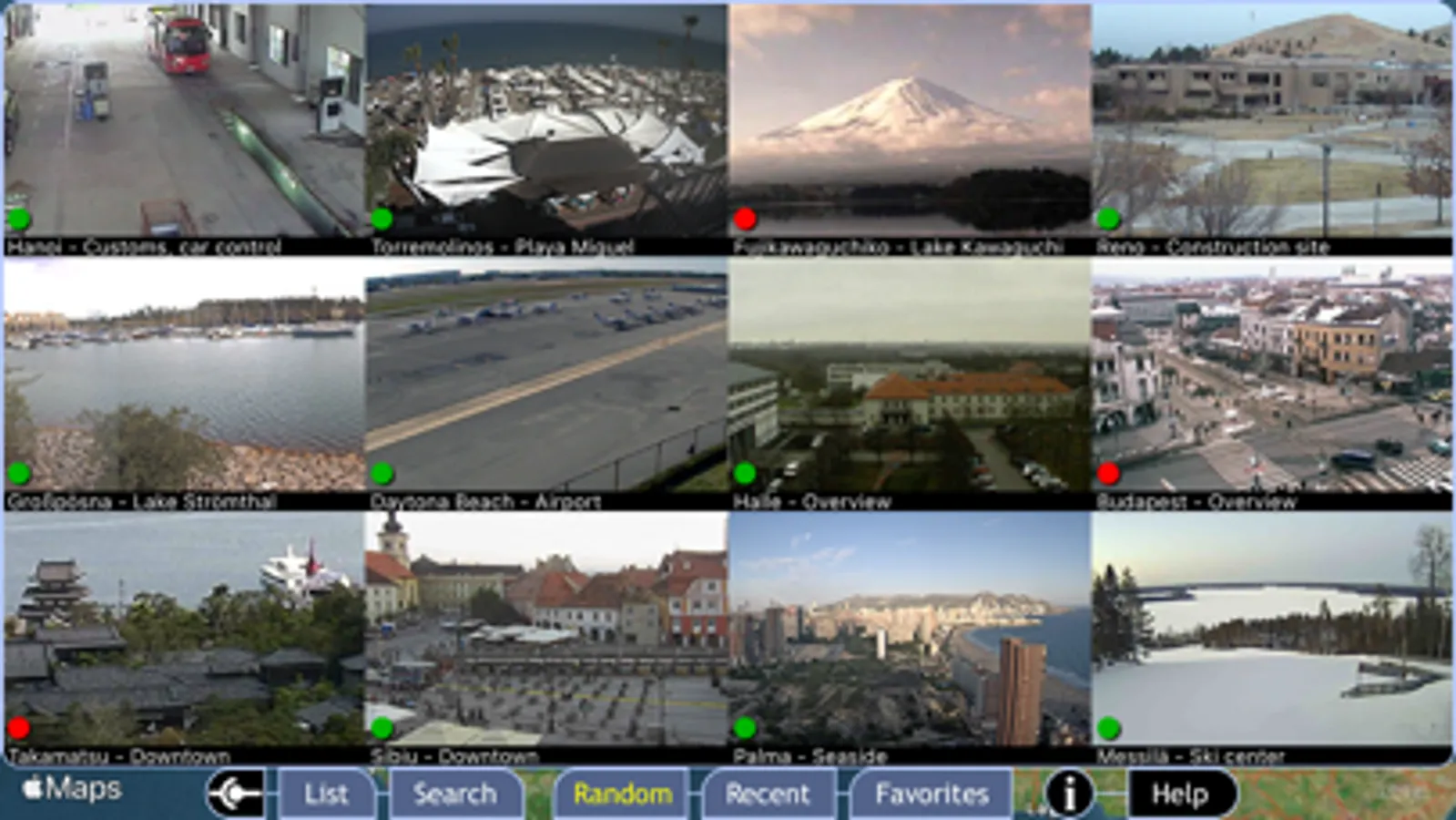 Choose from among several different ways to navigate: location map, location list, random, recent, and favorites. The simple search system lets you filter selected webcams, individually or in combination, by state, city, and subject.