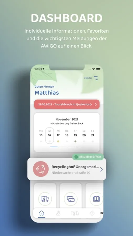 › Dashboard mit individuellen Informationen, Favoriten und den wichtigsten Meldungen der AWIGO