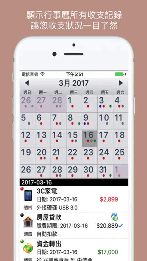 (藍點:收入、紅點:支出、黑點:該日尚有未繳費紀錄、灰點:該日皆已繳費、綠點:轉帳)