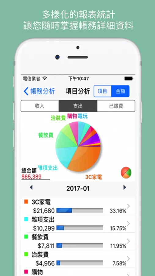 - 豐富的清單列表介面,隨時掌握您的收入、支出、繳費情形
