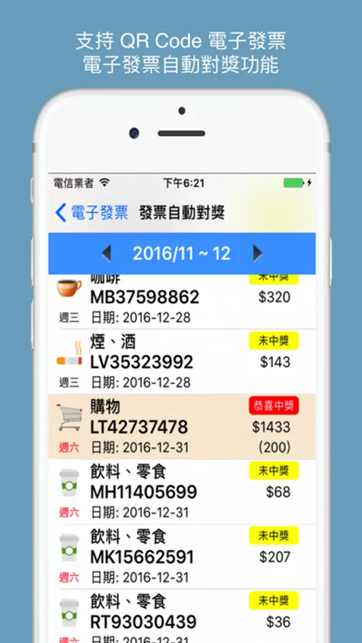 - 支持掃描 QR Code 電子發票 / 電子發票自動對獎 / 手機條碼匯入電子發票功能,讓您輕鬆記帳對獎一次完成