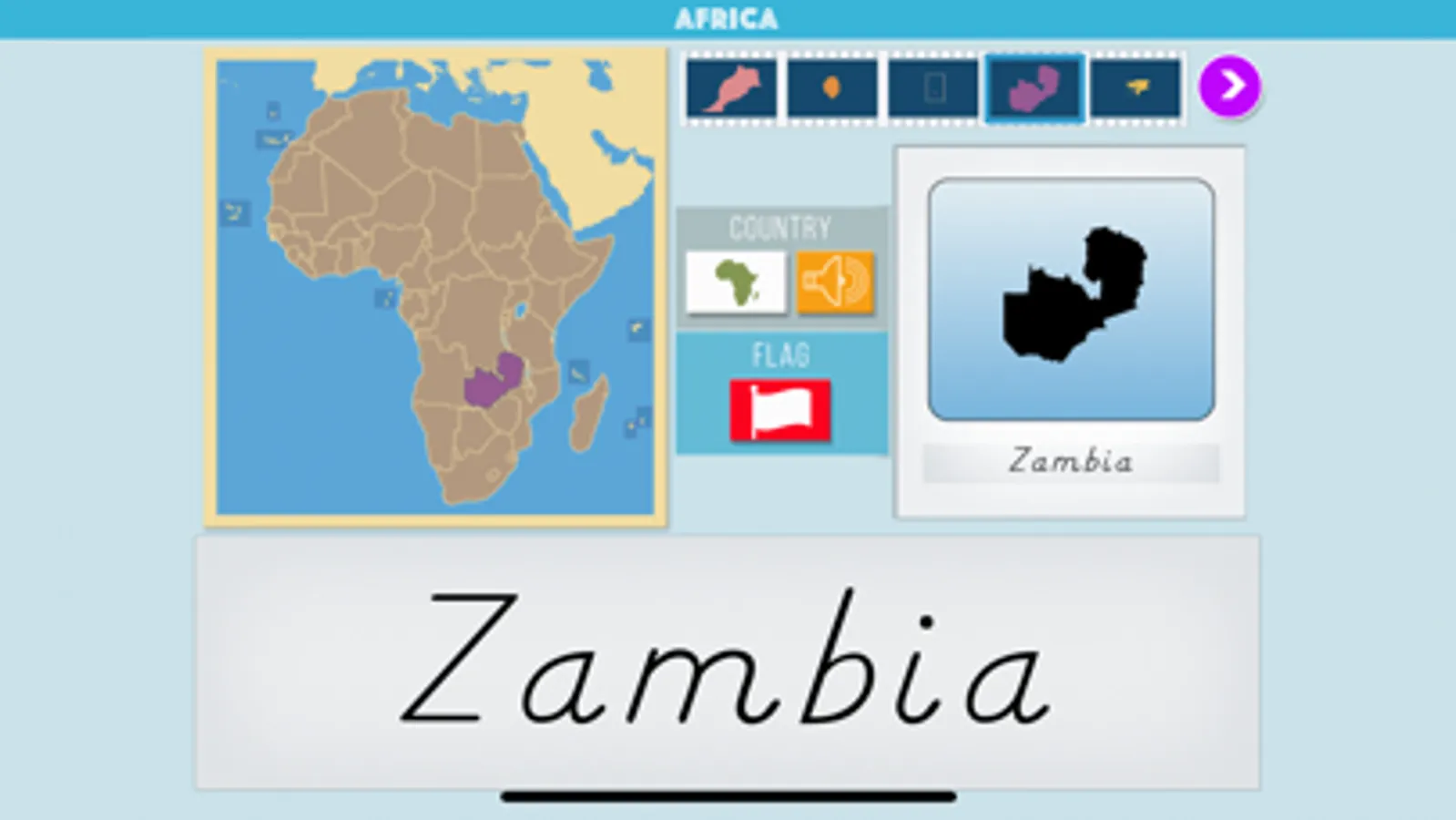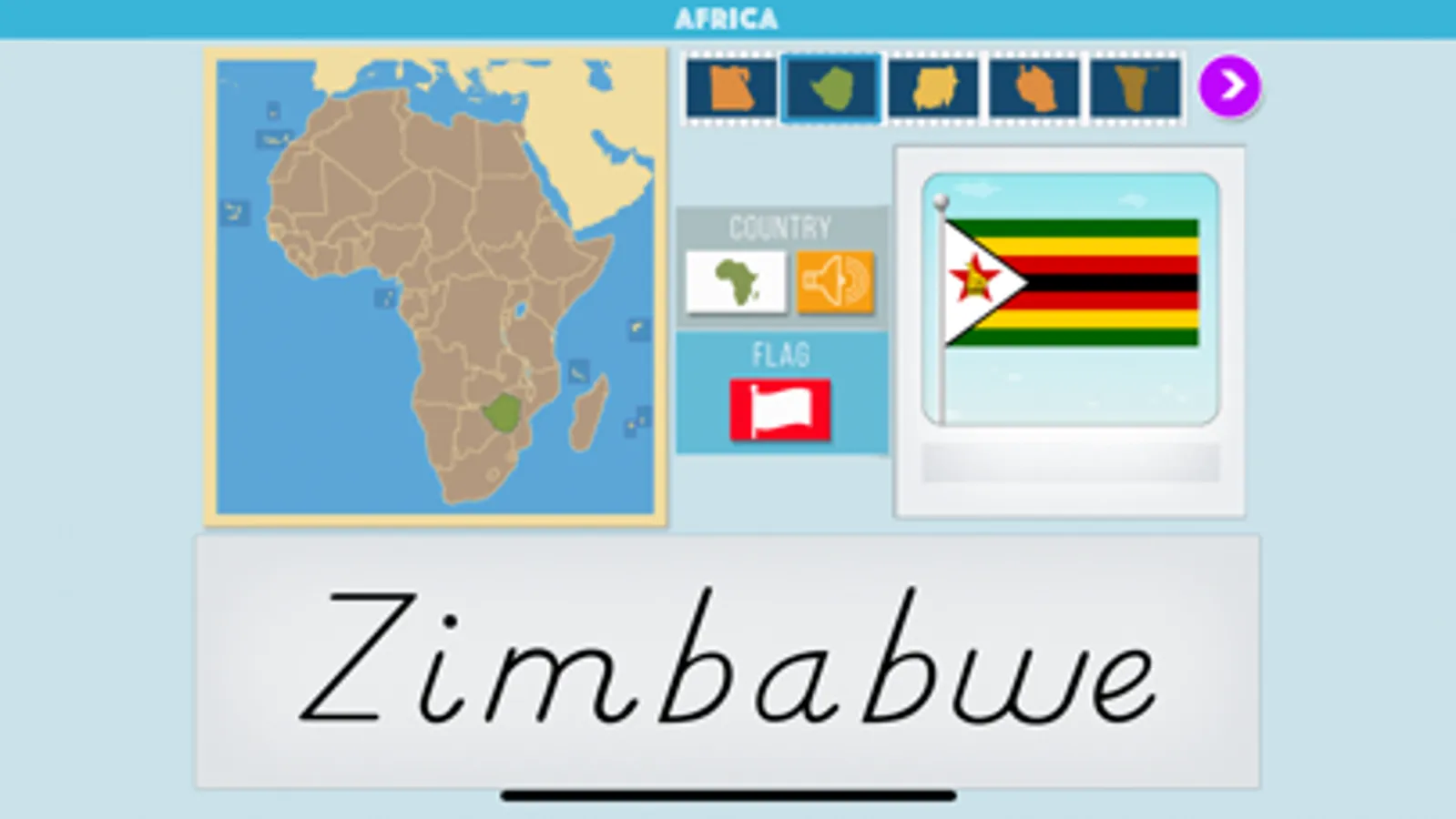 Touch a country in the filmstrip to change the featured country on the page. Touch the speaker button to hear the correct pronunciation of the country name and touch the compass button to see the country highlighted on the map. Now this app includes the Flags of Africa, as well! The map itself follows the same color scheme used for the physical materials in the Montessori classroom.