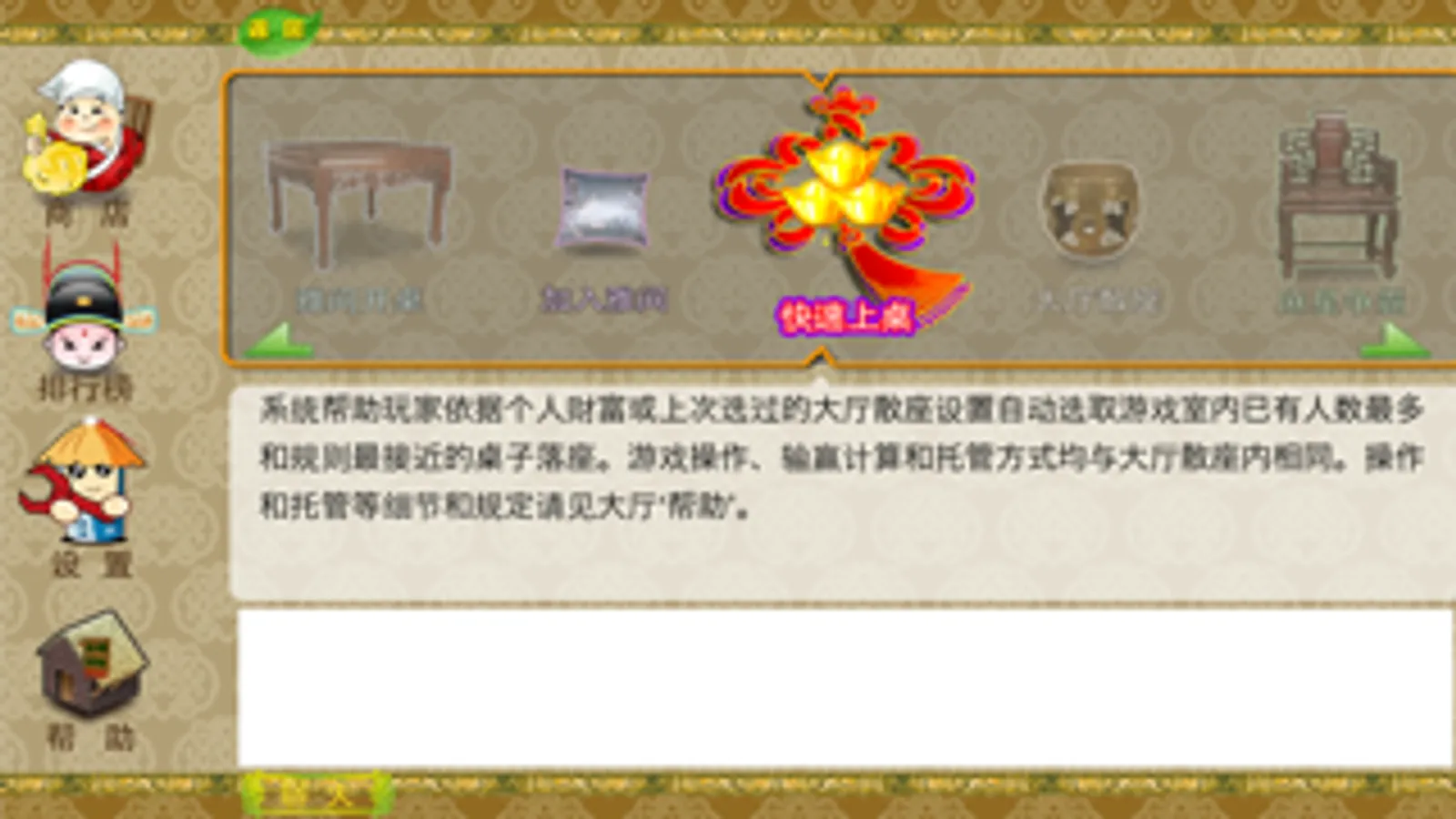 ‘单机篇’则秉承pharose系列益智游戏一贯强大的人工智能和清新独到的中国风茶馆设计。电脑陪客们的高超牌技;可自定义的灵活算番规则;犹如现场演奏的国乐经典曲目;可自选的二十余种方言配音;胡牌后的拍马搞笑语录;可向店小二换购的大牌牌架;尤其是胡牌后奖励的二级PK游戏等独家特色设计...令您在没有牌友凑手时, 也能真切地感受到坐上茶艺馆麻将桌的乐趣。