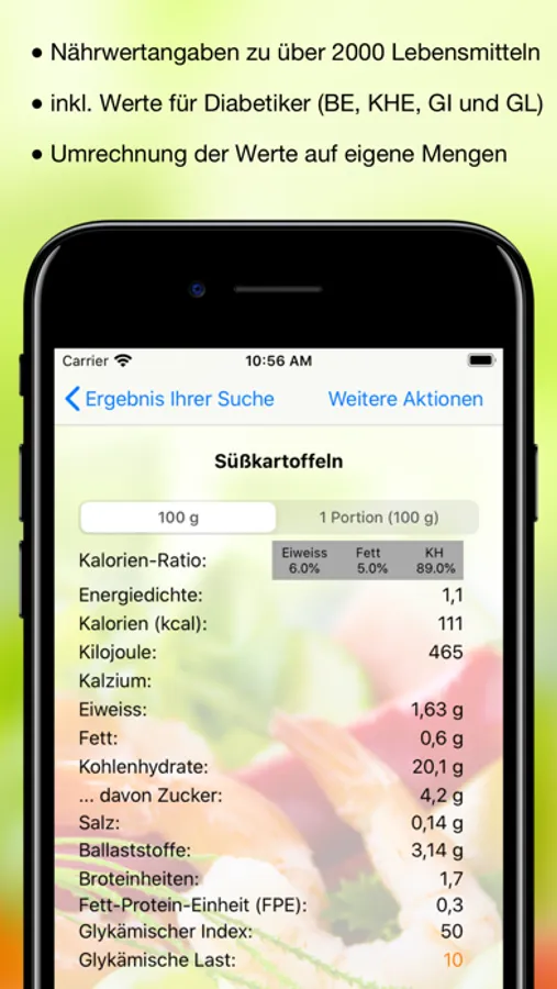 Für Diabetiker sind die Angaben zu Broteinheiten, Kohlenhydrateinheiten, glykämischem Index, glykämischer Last und Fett-Protein-Einheiten (FPE) besonders wertvoll.