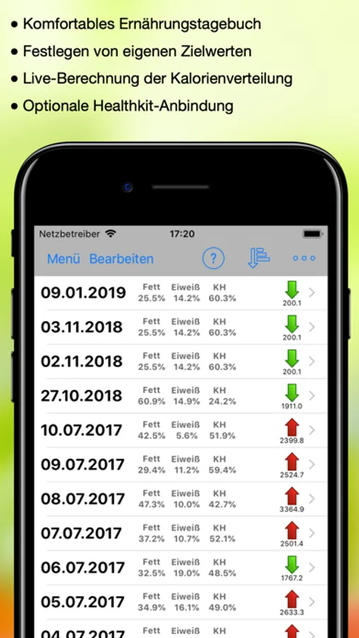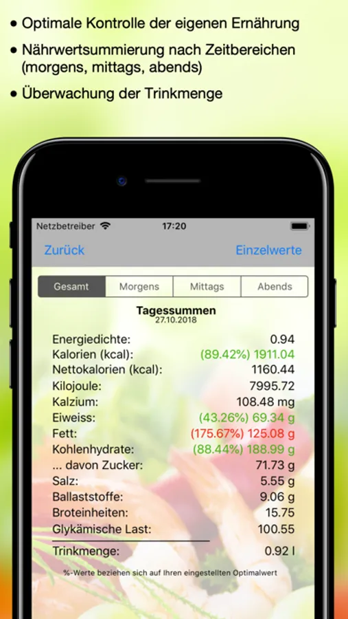 Mit dem integrierten Ernährungstagebuch behalten Sie Ihre Zielwerte jederzeit im Blick.