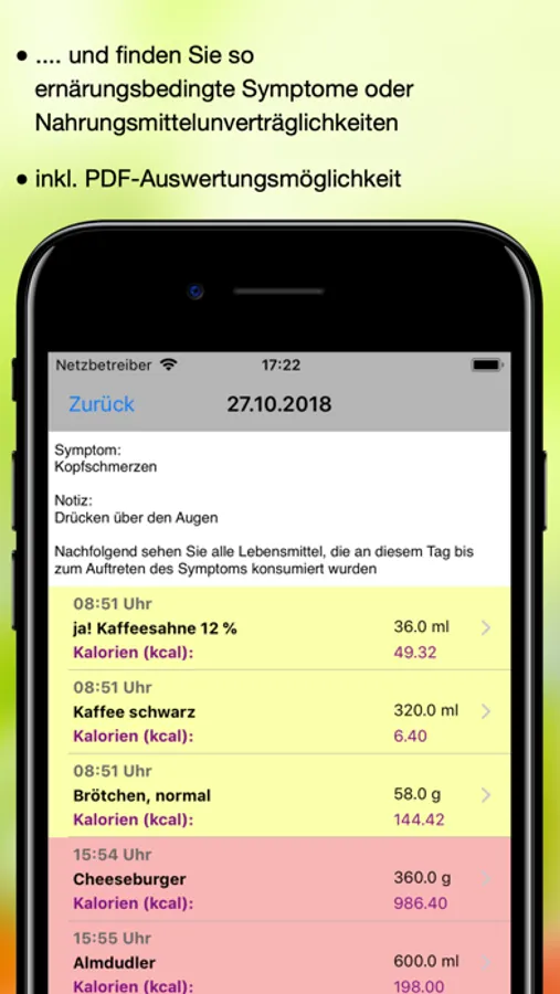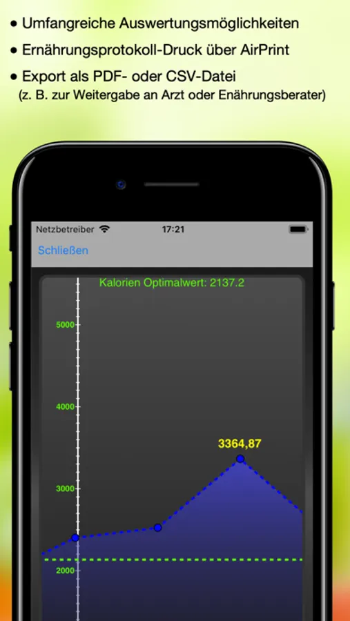 Exportieren Sie die Werte des Ernährungstagebuchs als PDF- oder CSV-Datei.