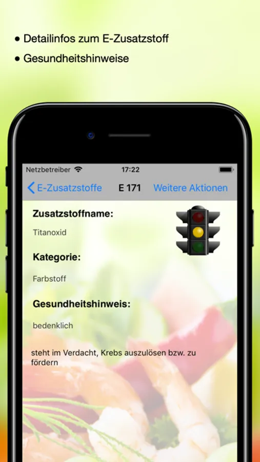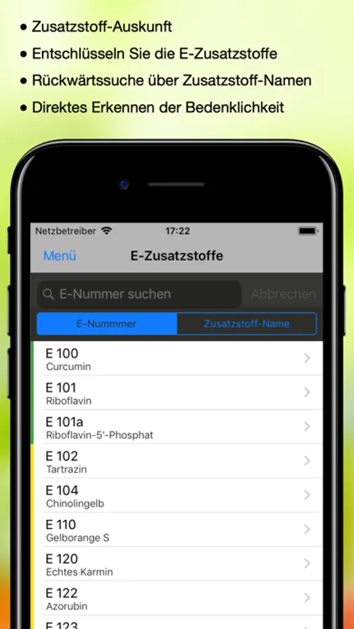 Suchen Sie nach einem Zusatzstoff der E-Reihe und Sie sehen sofort, welcher Stoff sich dahinter verbirgt bzw. ob dieser harmlos oder gesundheitsschädlich ist. Auch eine Invers-Suche ist möglich, denn viele Hersteller benutzen mittlerweile den Zusatzstoffnamen im Klartext.