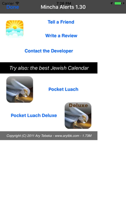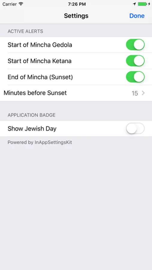 Alerts for Mincha prayer times that adjust automatically and in the background according to the date and your location. Can also show the day number of the Hebrew Date in the app icon.