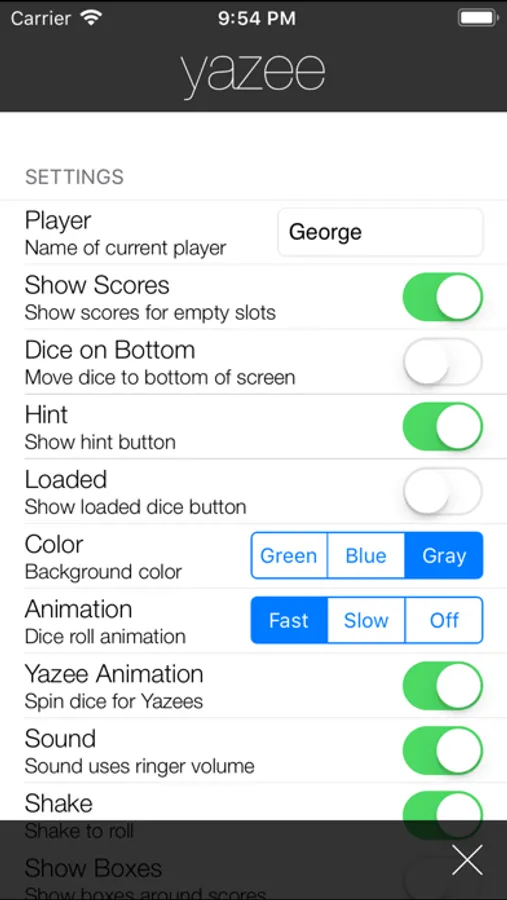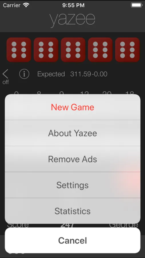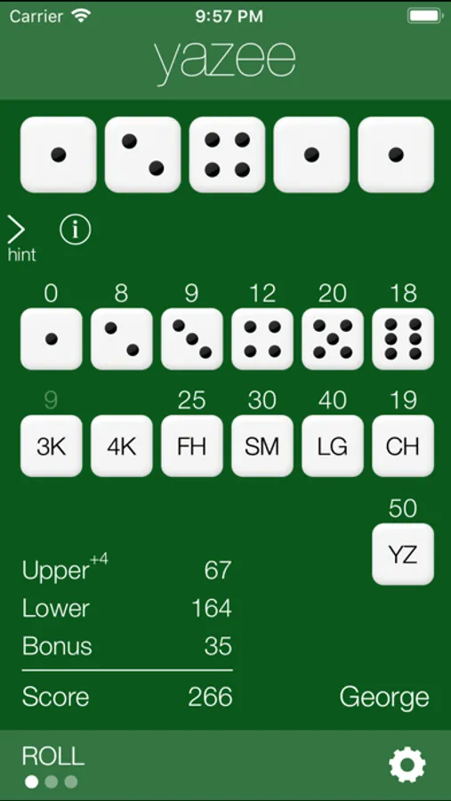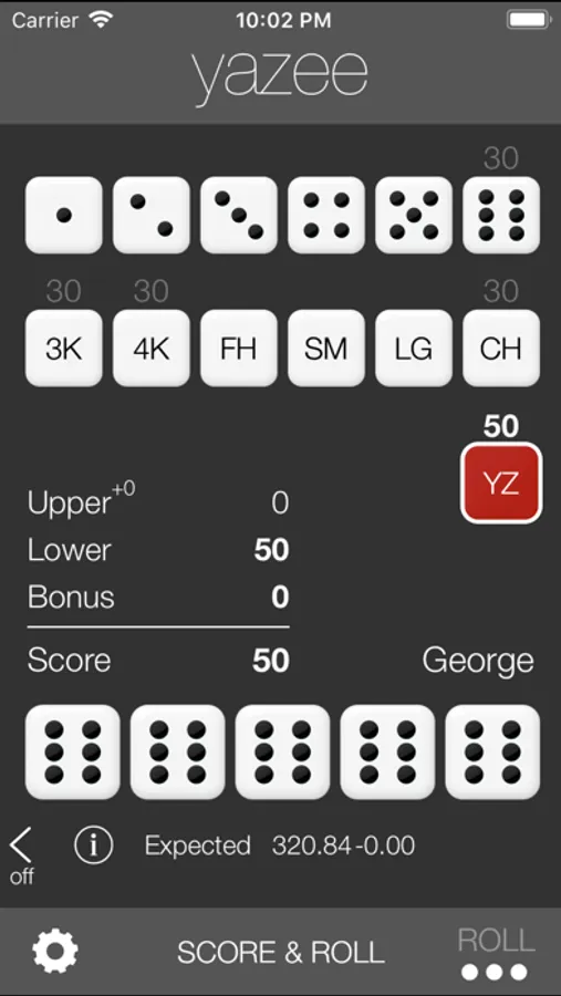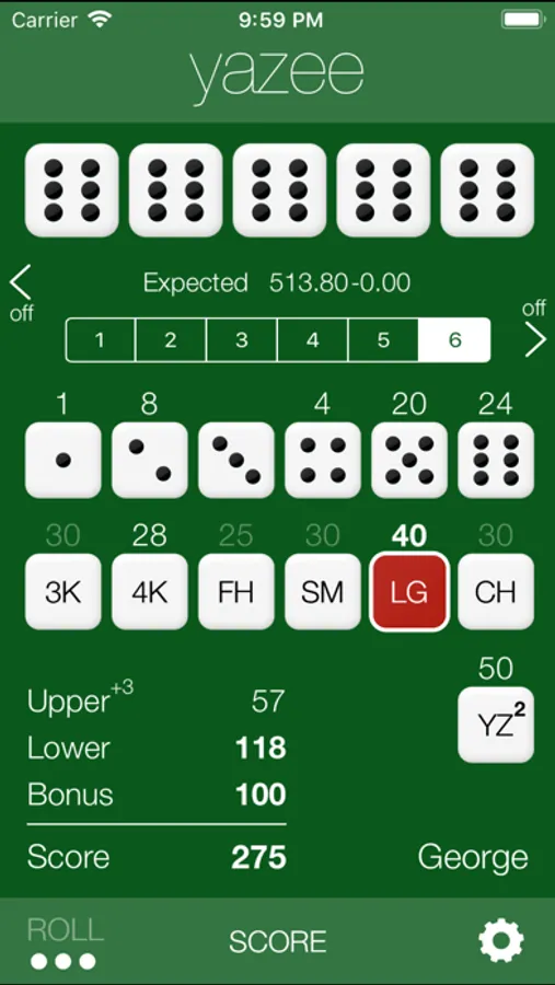 Yazee is a traditional dice game designed for simple and fast play. A Yazee (5 of a Kind) is 50 points, but a second Yazee yields a bonus of 100 points. Yazee is easy to learn, but difficult to master. Hone your skills using a hint that reveals the optimal choices.