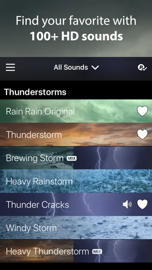 Rain Rain Original, Thunderstorm, Rain on a Tent, Rain Rain 3D, Ocean Waves, Summer Rain, Forest Rain, City Rain, Thunder Cracks, Rain Downpour, Crackling Fire, Slow Stream, Desert Wind, Blizzard Wind, Pink Noise, Airliner, Car in the Rain, Windy Storm, Rain Dripping, Gentle Stream, Chill Beats, Cat Purring and Shih Tzu Snoring.