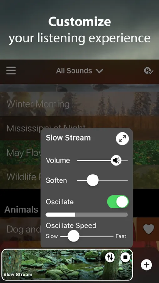 OSCILLATOR: Customize your experience with the Oscillator, which slowly fades a sound in and out, allowing you to create dynamic, varying soundscapes in concert with the Mixer. You can even adjust how fast the Oscillator changes the volume. When you save a Mix to your Favorites, your Oscillator settings are saved as well, allowing you to save and recall any number of custom soundscapes.