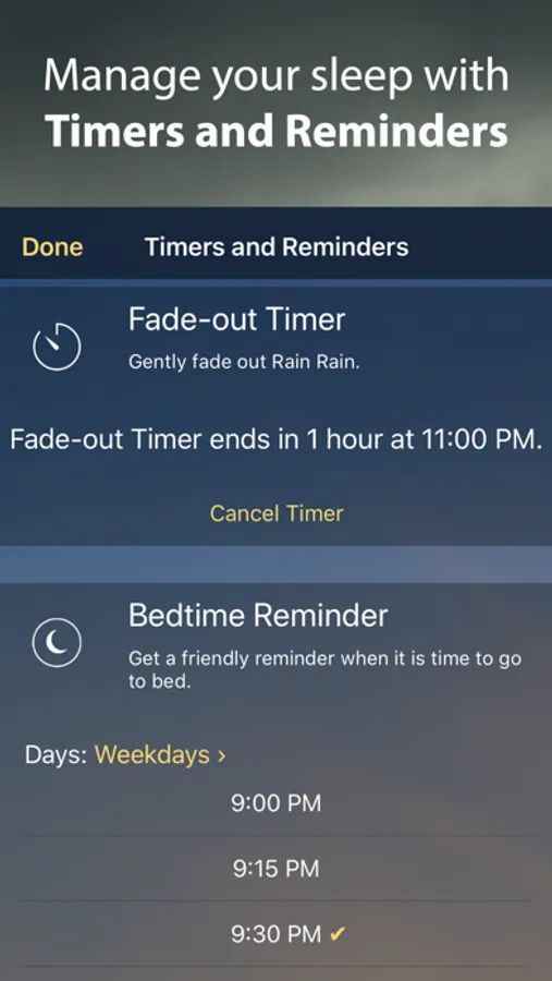 BEDTIME REMINDER: The first step to a better night's sleep is a healthy sleep schedule. Get to bed on-time with Rain Rain's Bedtime Reminder by setting the time and days you want a reminder. Rain Rain sends you a gentle, encouraging message when it is time to go to bed so that you can get the rest you deserve.