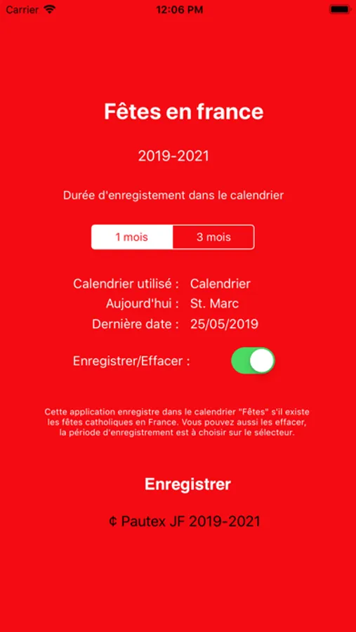 Reste à choisir la durée à partir du jour de la demande, 1 mois ou 3 mois. Il vous est possible d'enregistrer ou d'effacer les fêtes du jour pour cette période, l'événement posé reste unique même après plusieurs enregistrements, iCloud réalise ensuite la synchronisation vers d'autres appareils donc en principe vous n'utilisez l'application qu'une fois pour la durée indiquée.
